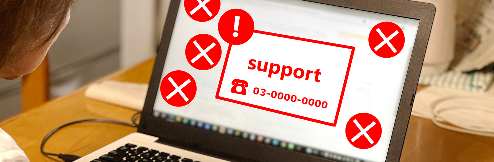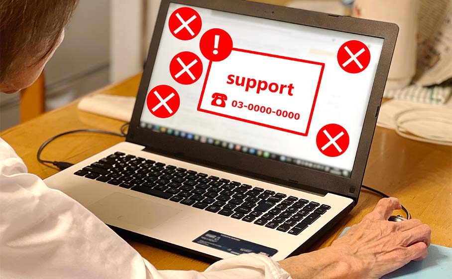 実在する会社のサポートセンター等を装い、偽のセキュリティ警告メールからスパムサイトへ誘導し、ウイルスに感染させ口座情報等を抜き取る手口です。また、Webサイト閲覧中などに、突然、偽のセキュリティ警告画面を表示し、記載されている番号に電話をかけさせて偽のサポートセンターへ誘導したうえで、サポート料などの名目で不正な送金を指示するほか、遠隔操作ソフトをインストールさせる手口もあります。不安をあおる画面が表示されたら、詐欺を疑いましょう。